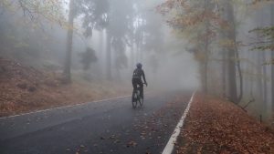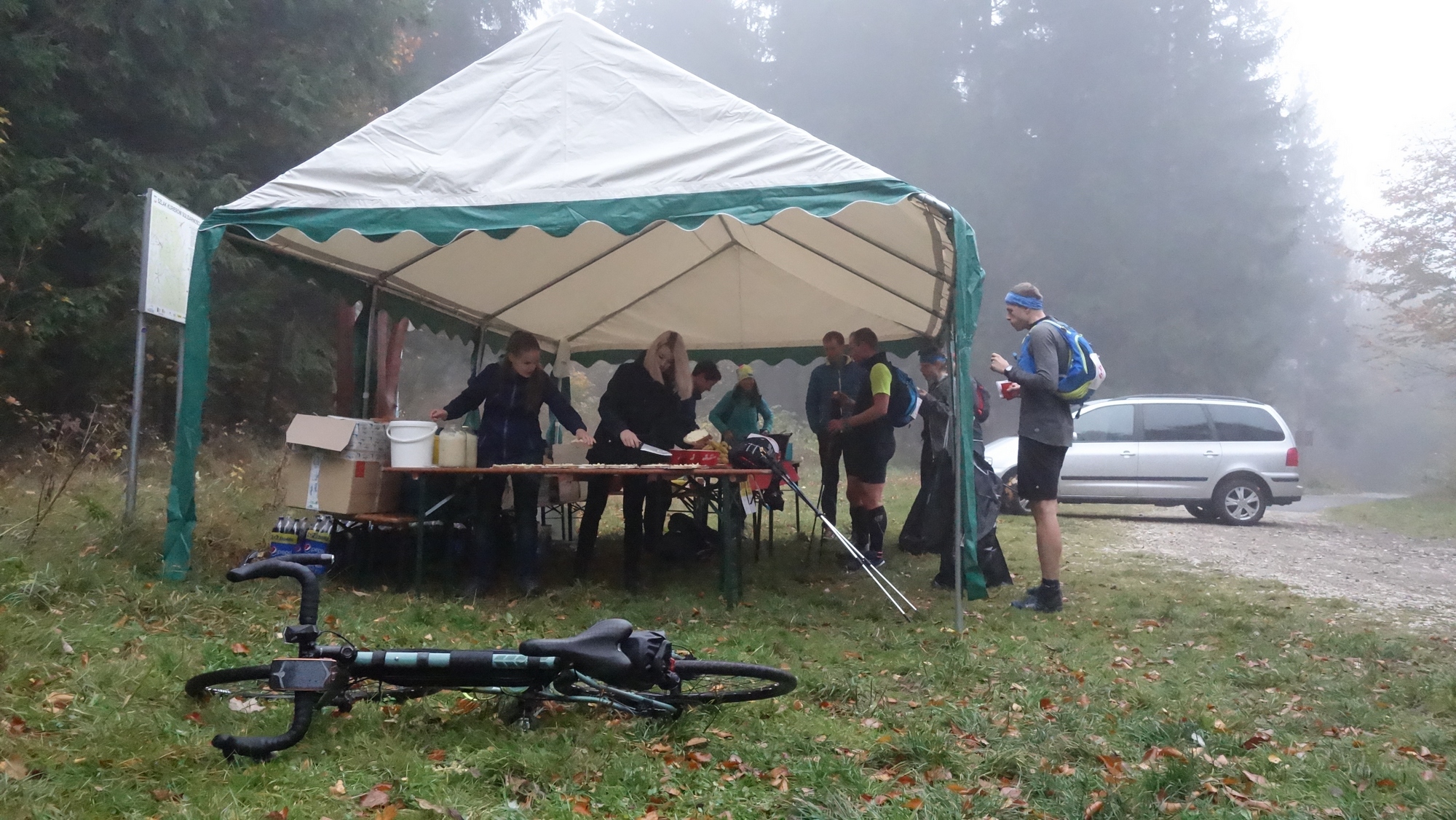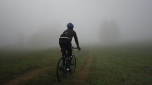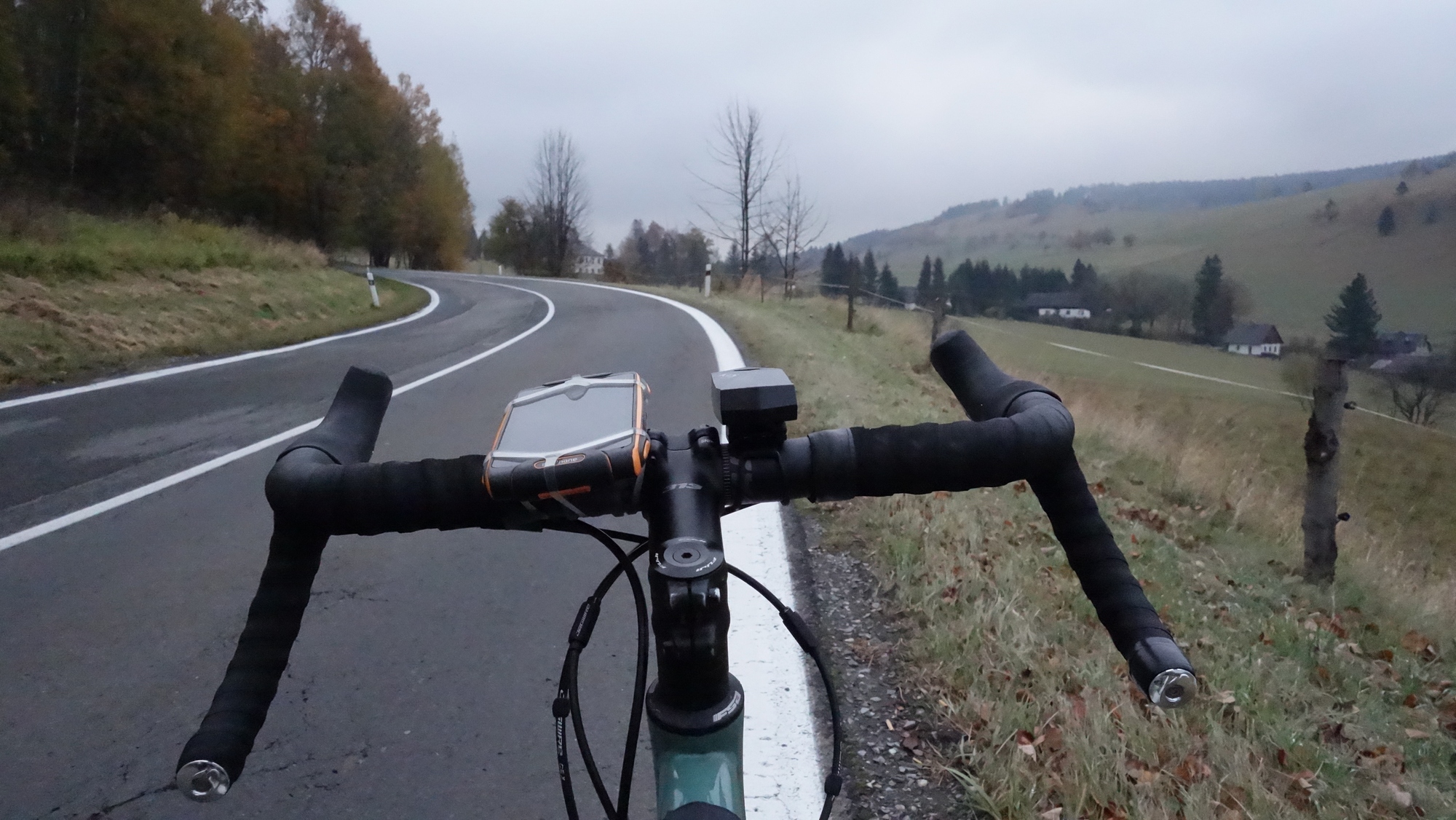 Tradycyjnie już ruszam porannym pociągiem do Kamieńca Ząbkowickiego. Zanim jednak wyjadę, jem na dworcu głównym o 5:00 rano porcję pierogów ruskich. Bilet kupuję w pociągu, jednak konduktorka nie jest w stanie wydać mi reszty z całej stówy. Czekam aż uzbiera drobne, ale na jedną stację przed Kamieńcem sytuacja nie ulega zmianie. Pytam czy może wystawić bilet z przedłużonym terminem płatności, okazuje się, że Koleje Dolnośląskie przewidują taką opcję. Zostaję spisany z dowodu osobistego i na peronie w Kamieńcu Ząbkowickim ląduję z biletem z formą płatności przelew 3 dni. Opłatę uiszczam natychmiast. Jest 6:30 20 październik. Po ciemku ruszam przez Kamieniec, kierując się do Złotego Stoku w którym stwierdzam, że niestety nie zabrałem ze sobą bidonów – tak to jest, gdy się człowiek pakuje o 3:30 nad ranem. W lokalnej Biedronce sprawdzam jakie są możliwości włożenia do koszyka sprzedawanych butelek z wodą i natykam się na wodę z kofeiną Polaris, której butelki idealnie pasują do rowerowych koszyków. Kupuję dwie i tak zaopatrzony kieruję się na Przełęcz Jaworową w stronę Lądka Zdroju. Na podjeździe zaczyna siąpić deszcz. Otula mnie mgła. Liście na drzewach rdzewieją i brązowieją. Aura jest wybitnie jesienna. W drodze z Lądka Zdroju do Stronia Śląskiego poruszam się długim odcinkiem asfaltowej drogi rowerowej. Od samochodów odpoczywam po zjeździe na drogę do Nowego Gierałtowa. Siąpi delikatny deszcz, po lewej stronie szumi Biała Lądecka. Wokół rozpościerają się łąki. Zjeżdżam na krótki, ale stromy podjazd na Przełęcz Gierałtowską – wąski asfalt niesie mnie pośród opadających liści. Na przełęczy Czesi urządzili punkt aprowizacyjny dla zawodników biorących udział w zawodach biegowych w trzech kategoriach z których najdłuższa, to dystans 78 km. Pytam Czechów o kawę, niestety mają jedynie colę, którą zostaję poczęstowany. Przejeżdżam przez totalnie zamgloną Przełęcz Gierałtowską po mokrej trawie i wjeżdżam na kamienistą drogę gruntową przechodzącą w końcu w asfalt 8 kategorii pocięty kilkumetrowymi odcinkami kamienistej ziemi, który kieruje mnie do czeskiej wsi Vojtovice a następnie miasta Žulová. Deszcz raz siąpi, raz przestaje. Sunę przyjemnym, równym asfaltem. Ruch samochodowy jest bardzo nikły. Po drodze mijam pawilon wejściowy do jaskini Na Pomezi – jest to druga ciekawa jaskinia w Rychlebach po Jaskini na Spicaku, tej jednak jeszcze nie odwiedziłem. Nie mam jednak czasu na penetrowanie podziemnych korytarzy. Przez Lipove Lazne dojeżdżam do Jesenika a następnie docieram do Beli pod Pradziadem. Stąd wspinam się na pierwszy podjazd, znak drogowy informuje o 11% nachylenia na odcinku 2 km. Podjazd trzyma kąt nachylenia. Osiągam 930 m n.p.m. wjeżdżając na Videlské sedlo a następnie tracę wysokość zjeżdżając na 750 m n.p.m. do miejscowości Vidly z której wspinam się na 1000 m n.p.m. na Sedlo pod Lyrou. Stamtąd znowu zaliczam zjazd do Karlovej Studánki na jakieś 820 m n.p.m. i stąd podjeżdżam na Sedlo Hvězda 825 m n.p.m. skąd zaczynam podjazd na Pradziada drogą na której ruch samochodowy jest limitowany trybem godzinowym. Jest ciepło ok. +9 st. C.Przestało padać. Pnę się w górę. Przed Ovčárną zaczyna się mgła, która narasta z każdym przejechanym metrem. Tuż przed szczytem dopada mnie zmęczenie. Jeszcze dwa kilometry więcej i na pewno bym się zatrzymał, aby odpocząć. Na szczycie +4 st. C. Koszulka pod kurtką jest mokra a kurtka z wierzchu delikatnie wilgotna. Popełniam błąd, ściągam rękawki i zakładam na mokrą koszulkę z krótkim rękawem koszulkę termiczną a na to wilgotną kurtkę. Robi się bardzo zimno. W restauracji okazuje się, że moja karta płatnicza nie działa – tak już z nią jest, że w Czechach raz jest obsługiwana, raz nie. Koron nie posiadam. Wychodzę z pękającej w szwach restauracji i ogarnia mnie znowu zimno. Postanawiam zjeść batonika, popić musem bananowym z foliowej torebki i zjeżdżać – w przenośni i dosłownie. Kieruję się na Głuchołazy. Jadę przed Vrbno pod Pradedem a następnie przez Zlate Hory podziwiając jesienne krajobrazy. Już rozgrzany i wysuszony przez oddający ciepło organizm szukam w Głuchołazach knajpy w której mogę coś zjeść. Mam 2 godziny do pociągu do Wrocławia z międzylądowaniem w Opolu. Znajduję włoską restaurację zamawiam pizzę i po kolei dwie czarne herbaty. Na stacji benzynowej kupuję jeszcze colę i syntetycznego rogalika z czekoladą. Wsiadam do pociągu i dowiaduję się, że to nie koniec przygód na dzisiaj .Na trasie Głuchołazy – Opole obowiązuje autobusowa komunikacja zastępcza pomiędzy miejscowościami Łambinowice i Szydłów. Konduktor twierdzi, że kierowca autobusu prawdopodobnie nie zabierze mnie z rowerem do pojazdu. Po przyjeździe do Łambinowic nie ma jeszcze autokaru, wykorzystuję więc cenne minuty i ruszam w trasę. Do przejechania mam 15 kilometrów jak się okazuje w grobowych ciemnościach. Próbując nie zgubić trasy na kilku skrzyżowaniach dojeżdżam w końcu do Szydłowa przed autobusem zajeżdżającym po drodze na kilka lokalnych stacji. Dalsza część podróży przebiega w sposób niezakłócony. Już w domu przekonuję się, że manipulując aparatem w rękawiczkach musiałem ustawić jakiś dziwny tryb, bo żadne ze zdjęć nie jest ostre a szumy powalają wielkością. Udaje mi się za to wykorzystać trochę materiału z kamerki i montuję krótki film.